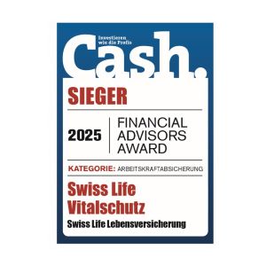 Der Swiss Life Vitalschutz wurde mit dem diesjährigen Cash. Financial Advisors Award in der Kategorie „Arbeitskraftabsicherung“ ausgezeichnet und zählt damit zu den besten Produkten am Markt (Stand 10/2025).