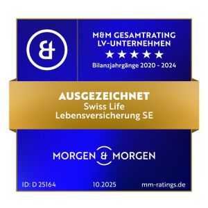Im aktuellen MORGEN & MORGEN Rating der Lebensversicherungsunternehmen erhält Swiss Life erneut die Bestbewertung von 5 Sternen und wird damit für ihre ausgezeichnete Unternehmensqualität bestätigt (Stand 10/2025).